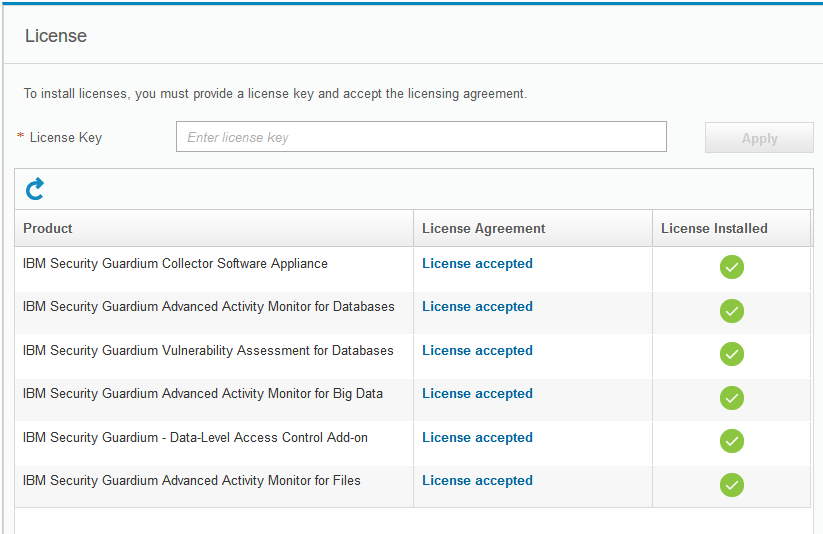 A few more licenses are entered in the same manor to unlock functionality of Guardium V10 – all clearly identified which products have been licensed: