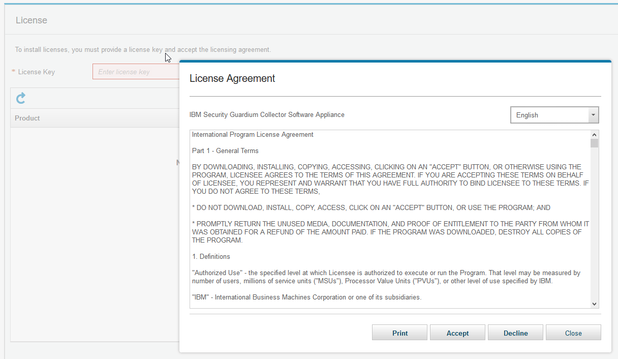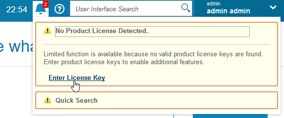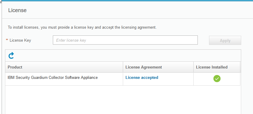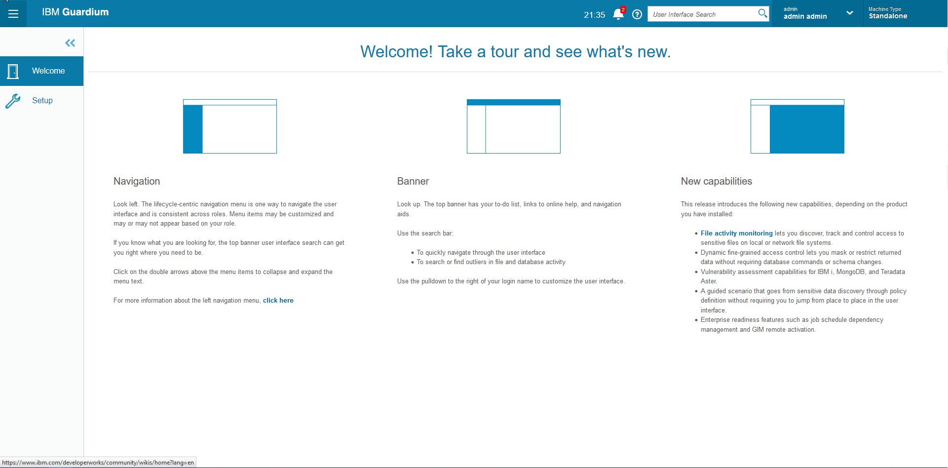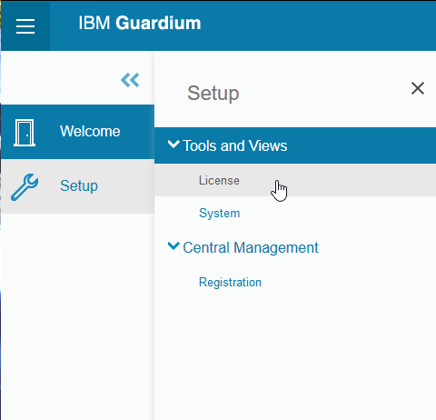 Here, Guardium has detected the product is not yet licensed and provides a jump link to the setup and licensing screen normally found here: