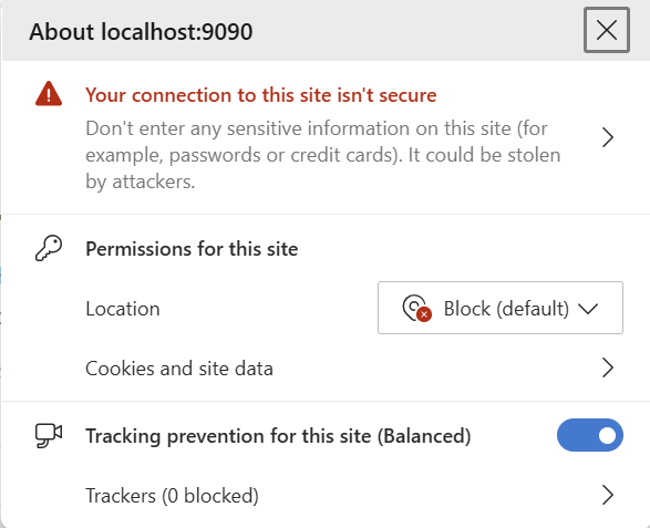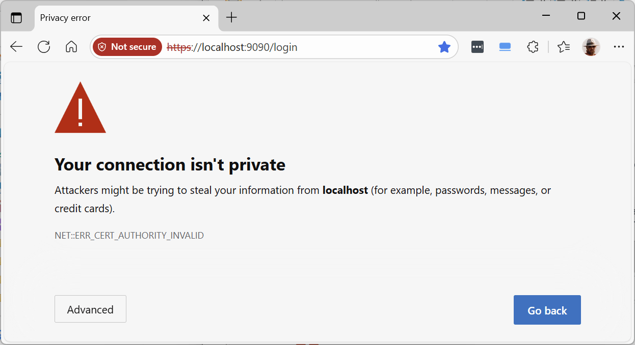 After stopping and restarting the HQ Server and Agent, the following results when attempting to connect in a browser (Microsoft Edge was used, others such as Chrome will be similar) either to HTTP on port 8080 (which is redirected) or HTTPS on port 9090 directly: