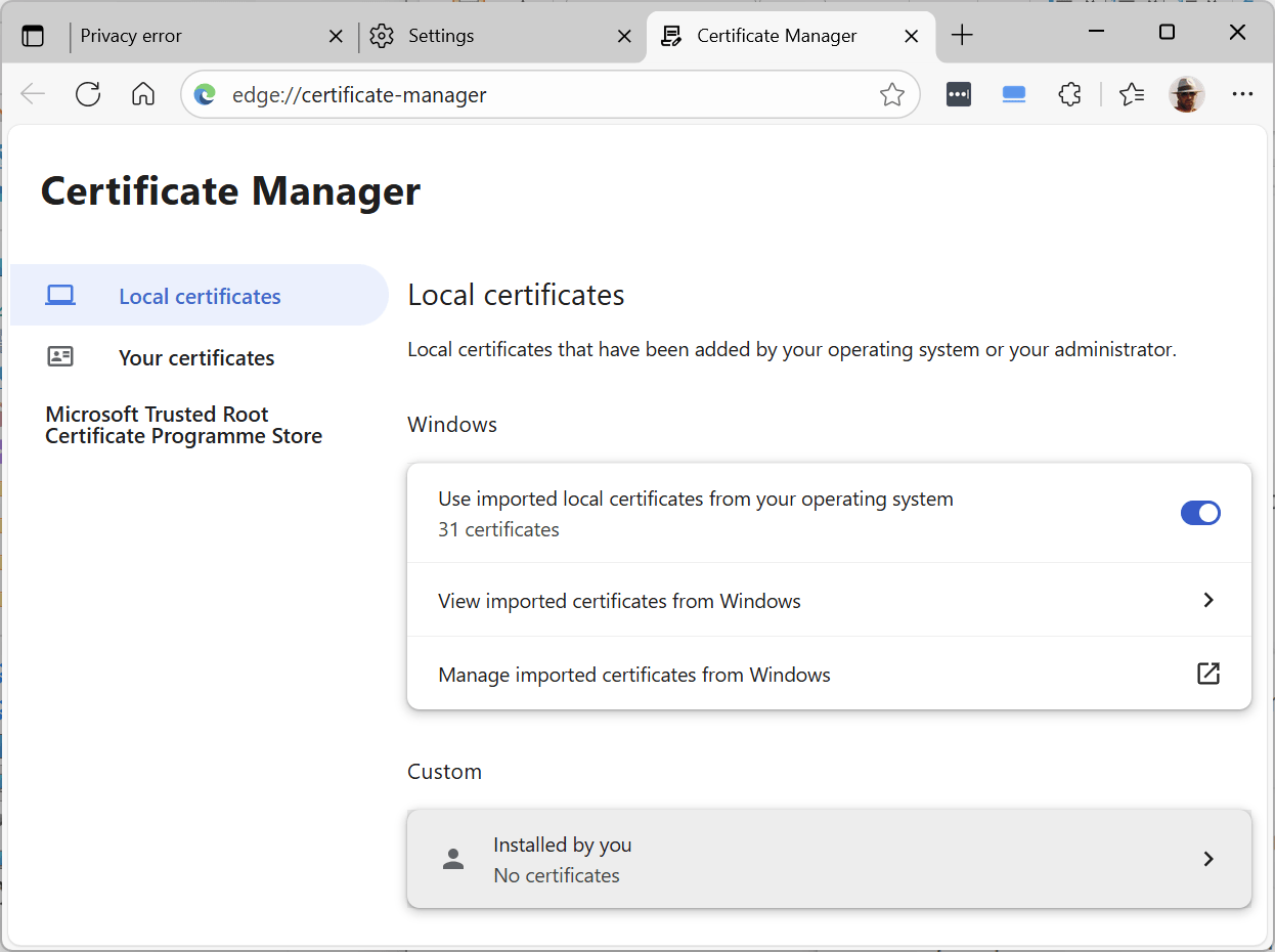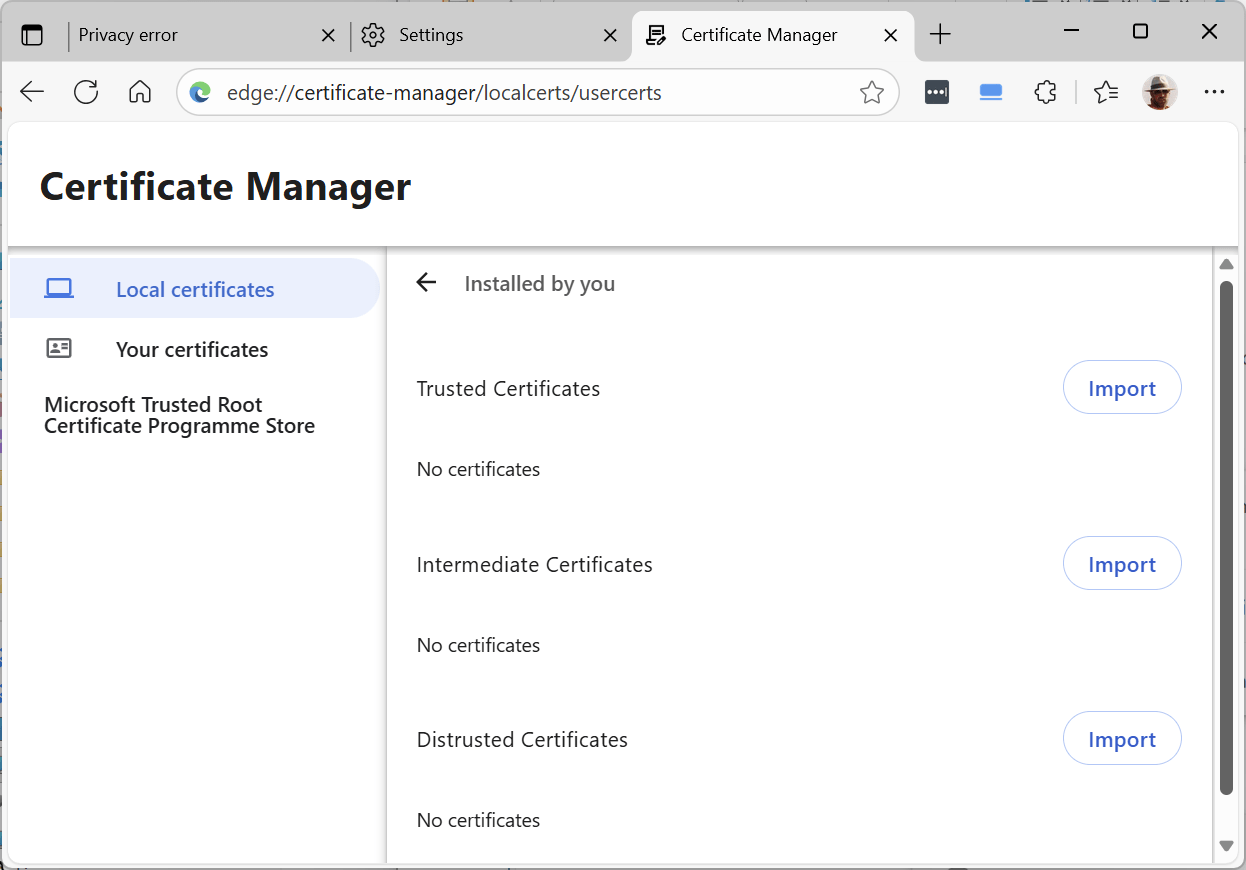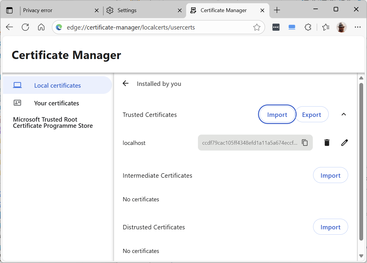 7. Click the Import button alongside “Trusted Certificates” (after deleting any previous attempts):