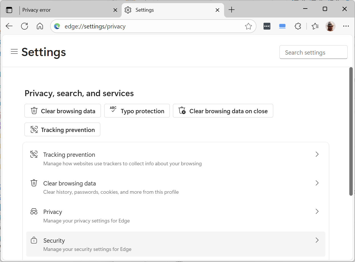 3. In the left-hand navigation pane, click on “Privacy, search, and services”: