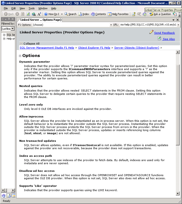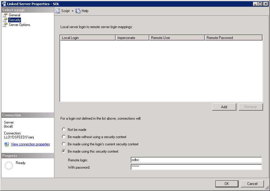 Start up the SQL Server Management Studio, and find “Linked Servers” in the Object Explorer. Set as follows: