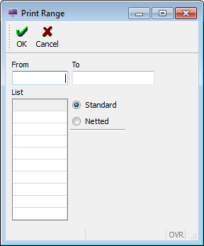 In our example above all of the elements of the dialog are of the same type, but this doesn’t have to be the case. In the following screenshot, we see another part of the application where we are printing several orders in one go, from either a range and/or a list of order numbers, and to choose a layout format. Combining the two statements in a DIALOG means exactly the same as above; you can do it in just one hit, so to speak.